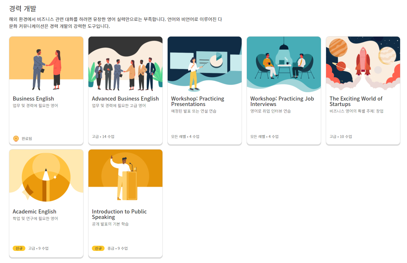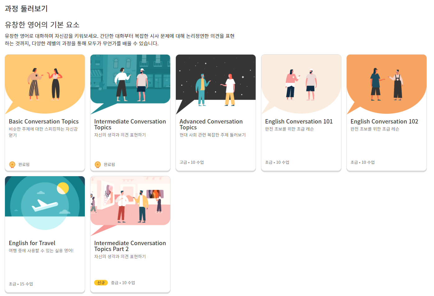 단점: 수업 코스가 적다. 새로 개발되고 있지만 코스 선택 폭이 좁다. 코스 안의 자료들이 완벽하지 않을 때가 있다.