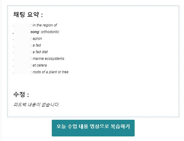 수업 비디오를 보면서 복습하는 것이 가장 베스트지만 너무 귀찮고 어렵다면 채팅창에 알려준 내용만이라도 복습하면 좋습니다. 당일 수업 중 제가 틀린 표현이나 어려운 단어 유의어 등을 튜터가 채팅으로 쳐주시니까요.
