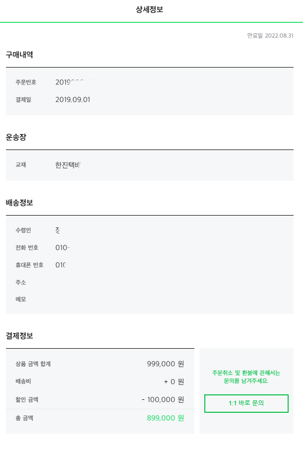 일단 구매내역 인증이다. 2019년 9월 1일에 10만원 할인 쿠폰 준다고 해서 결제했다.